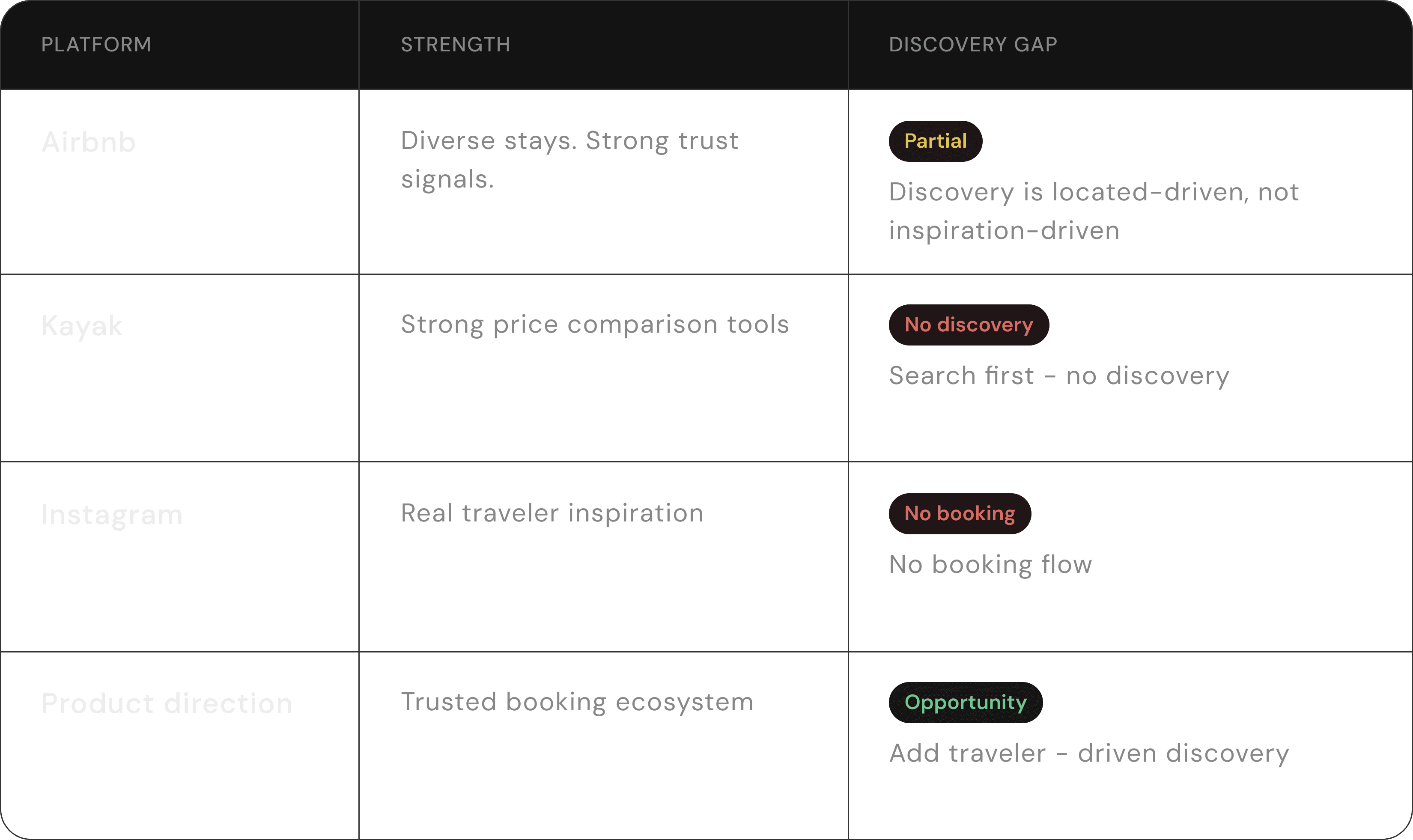 Competitive analysis across major travel platforms revealed a consistent pattern - discovery and booking happen in separate ecosystems.